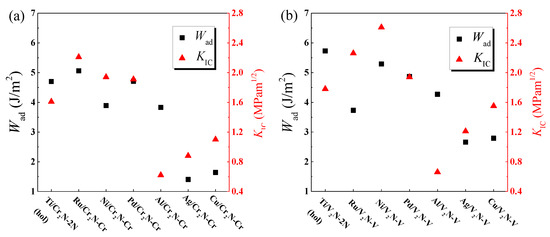 The combination of the interfacial work of adhesion Wad and the interfacial fracture toughness KIC of the (a) M/Cr2N and (b) M/V2N interface models considered, respectively.