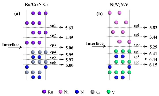 To achieve further understanding of the mechanical strength of the Ru/Cr2N-Cr and Ni/V2N-V interfaces, the interfacial weak point is investigated for the two interface models [53]. We assume that both interface models are to be cleaved along six different planes. Cleavage energies are related to the number of bonds broken; therefore, all the cleavage planes are selected by considering the minimum bonds to be cut along these planes. For the Ru/Cr2N-Cr interface model, the cleavage planes are between the 1st and 1st layers of Ru(0001) and Cr2N (0001), the 1st and 2nd and 2nd and 3rd layers of Ru(0001), and the 1st and 2nd, 2nd and 3rd, and 3rd and 4th layers of Cr2N (0001). For the Ni/V2N-V interface model, the cleavage planes are between the 1st and 1st layers of Ni(111) and V2N (0001), the 1st and 2nd and 2nd and 3rd layers of Ni(111), and the 1st and 2nd, 2nd and 3rd, and 3rd and 4th layers of V2N (0001). For simplicity, these cleavage planes are denoted as cp1~cp6, respectively (as shown in Figure 11).