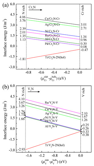 Interfacial energies of the (a) M/Cr2N and (b) M/V2N interface models as a function of chromium chemical potential ( − ) and vanadium chemical potential ( − ), respectively.