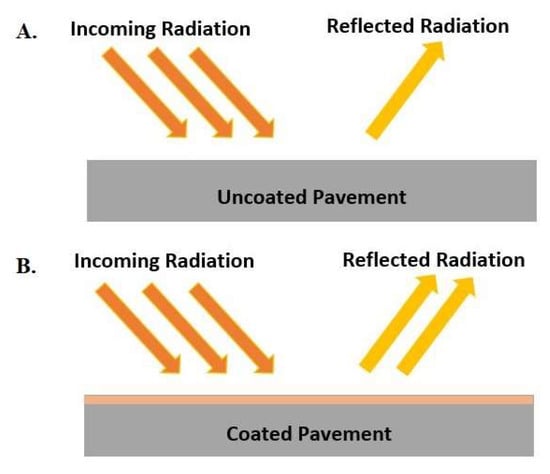 Previous studies have shown that using these functional coatings can reduce the surface temperature of asphalt pavements by 13 °C, and white concrete by 4 °C, depending on the type of asphalt or concrete and the coating used [14,20,21]. Increasing the albedo of pavements using heat-reflective coatings has many benefits including emission reductions, improved comfort, increased driver safety at night, reduced street lighting cost and slowed climate change [14,20]. Albedo defines how well this surface would reflect solar energy and varies between 0 and 1. A value of 0 means the considered surface is a perfect absorber, and a value of 1 means that the surface is a perfect reflector. Thus, solar reflectance refers specifically to visible light only, the visible portion of the solar radiation spectrum. The term, albedo, refers to the overall solar radiation reflectance, not just the visible portion of the spectrum [22]. The basic concept of the heat-reflective coatings can be seen in Figure 1. An uncoated paved surface reflects less solar radiation, as shown in A, than a surface that is coated, shown in B. Because of this, the coated surface remains cooler than the uncoated surface during the day. Note that, albedo is the measure of the diffuse reflection of solar radiation out of the total solar radiation and is measured on a scale from 0, corresponding to a black body that absorbs all incident radiation, to 1, corresponding to a body that reflects all incident radiation. Surface albedo is defined as the ratio of radiosity to the irradiance (flux per unit area) received by a surface [23]. The proportion reflected is not only determined by properties of the surface itself, but also by the spectral and angular distribution of solar radiation reaching the Earth’s surface. These factors vary with atmospheric composition, geographic location, and time. While bi-hemispherical reflectance is calculated for a single angle of incidence, albedo is the directional integration of reflectance over all solar angles within a given period. The temporal resolution may range from seconds (as obtained from flux measurements) to daily, monthly, or annual averages. For fresh asphalt albedo is 0.04, and for worn asphalt albedo is 0.12 [24], while new concrete can achieve an albedo of 0.55 [25].