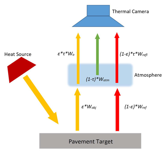 When using IRT, essentially, the larger the intensity of infrared radiation, the higher the temperature is. However, when receiving radiation from a target object, the thermal camera also receives radiation from many different sources, including the absorbed and reemitted radiation from the target object, the reflected radiation from the target object, and the radiation from other sources, including the objects’ surroundings and the atmosphere [26], as shown in Figure 2. It is noteworthy that the radiation from these multiple sources is measured at different wavelengths. However, our thermal camera, FLIR T430SC, records long-wave infrared radiation between 7 μm and 14 μm.