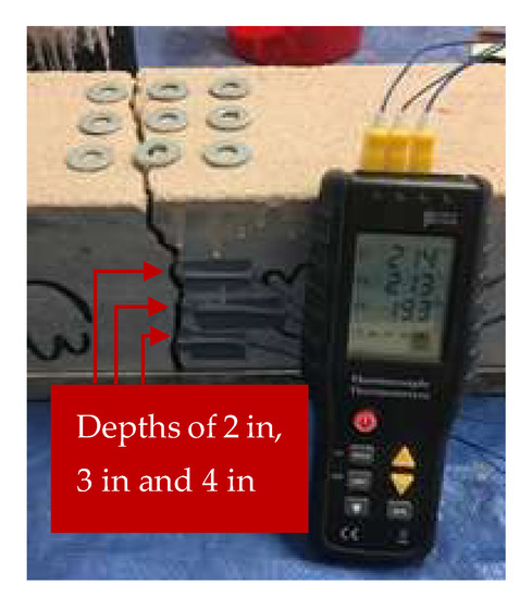 Two types of pavement materials, concrete and asphalt, were used to determine the effectiveness of heat-reflective coating. To begin, a 6 × 6 × 20-inch concrete slab was cast for use as a sample with no reinforcement included within. The strength of the slab was measured at 4500 psi. The slab was then broken into two separate pieces using a flexure test machine. The thermocouples were then placed inside the crack at the very center (3 inches from either side) at depths of 2 inches, 3 inches and 4 inches, as shown in Figure 5.