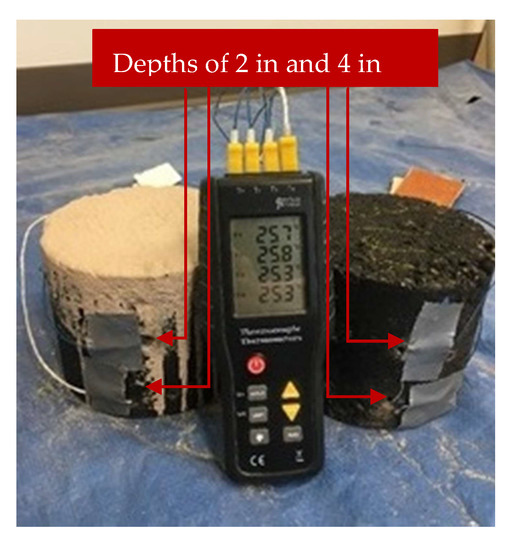 For the asphalt, two cylinders were supplied by Idaho Asphalt Supply in Nampa, Idaho. These had a height of 5 inches and radius of 3 inches. The dimensions of both concrete beam and asphalt cylinders were chosen in such a way that their cross-sectional areas closely matched with each other, so that the experiment provided a logical temperature comparison between them. One of these samples was coated with the heat-reflective coating. Two holes were then drilled into each cylinder at 2-inch and 4-inch depths, respectively. The thermocouples were then placed in these holes at 1.5 inches deep in the uncoated cylinder and 1.75 inches deep in the coated cylinder, as shown in Figure 6.