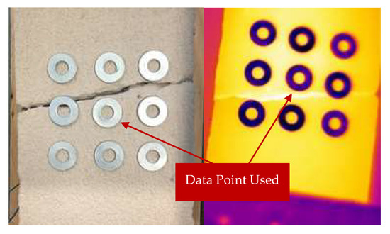 The surface points were chosen based on the placement of the subsurface thermocouples. In total, there were 9 surface points where temperature was measured for concrete, as shown in Figure 7, and 6 points for the asphalt, as shown in Figure 8. The middle point in Figure 7 was situated directly above the thermocouples, 3 inches from each side. The remaining points formed a grid pattern surrounding the center point at distances of 1.5 inches from the center. It is noteworthy that the steel rings are used for thermal point calibration. Marking the points on the pavement with a marker would both skew the results and not show up in the thermal image; however, the rings allowed the points to be accurately positioned from the pavement to the thermal image camera for data collection. Once the data points from the computer program were placed in the center of each ring, the rings were removed, and the trial was started. Additionally, none of the points were placed on top of delamination in the pavement, such as the small gap from the thermocouple crack in the concrete sample, so that these steel rings would not affect the measured temperature at that point. For the asphalt, the two center points were placed above the thermocouples while the other two on each sample were placed on a line through the center 1.5 inches from either edge. Thus, the distances in between the data points for both concrete and asphalt samples were kept the same, in order to meaningfully track the temperature changes in those target areas. For this experiment, only the temperature data from one point, the one situated above the thermocouples, was analyzed. The remaining data points were taken for future study. Figure 7 (right) and Figure 8 (right) show the calibration of these surface points with the thermal camera (FLIR Teledyne LLC, Wilsonville, OR, USA) for the concrete and asphalt samples, respectively.