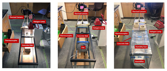 Our in-house experimental setups for controlled heating, airflow heating and humid heating can be seen in Figure 9. In the controlled heating photo, the sample is in the heating phase, whereas, in the airflow and humidity tests, the sample is in the cooling phase. While this figure shows the set up with concrete, the only difference during asphalt testing was that the two cylinders were placed side by side in the same location as the concrete. An example of this change is shown for the controlled heating test on the asphalt samples in Figure 10. This was taken during the heating phase, and the thermal camera was removed from its stand so it would not overheat. Each case was numbered for concrete and asphalts samples, as indicated in Table 1.