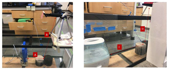 Diagram showing the dimensions of the experimental setup from the fan to the center point: (A), 30.5 cm, thermal camera to concrete surface (B), 70 cm, humidifier to center point (C), 56 cm, and halogen lamp to concrete surface (D), 44 cm.