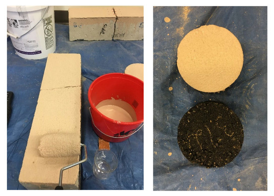The heat-reflective coating used was supplied by Decorative Paving Solutions in Tempe, Arizona and came in three parts: part A, part B, and colorant, as shown in Figure 13. Before use, the directions state that all three parts are mixed together with half a gallon of water. Once mixed thoroughly, it must be used within 12 h. The five-gallon bucket received coats of about 200–250 square feet. Because the samples used in this study were only about 1 square foot, a ratio based on the weight of each component was determined. For the concrete coating, 0.5 kg of part A was mixed with 0.12 kg of part B, 0.02 kg of the colorant and 0.038 kg of water. The coating was applied to the surface of the sample using a roller brush in five coats measuring out to a thickness of 3 mm, as shown in Figure 14.
