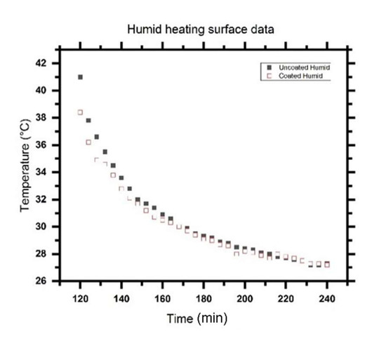 The surface temperature during cooling for both uncoated and coated asphalt in humid conditions.