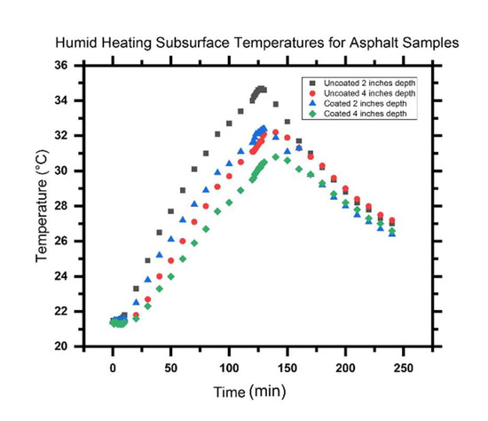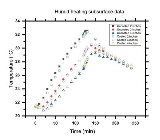 Humid heating (Case 5): During humid conditions, the observed temperature difference between the coated and uncoated asphalt surfaces was 4 °C directly after the two hours of heating. This was nearly identical to the temperatures seen in the controlled heating conditions. The uncoated asphalt once again cooled down slightly faster than the coated asphalt, and the two samples were at the same temperature after about 80 min of cooling, as shown in Figure 23. This was again caused by the larger temperature gradient between the uncoated asphalt and the air. The subsurface temperatures for the humidity test also showed good cooling effects from the heat-reflective coating, as depicted in Figure 24. However, these were smaller than what was shown in normal heating. Here, a latency period in heating up the surface exhibits a small temperature decrease at the beginning. The coated asphalt was 2 °C cooler at a 2-inch depth than the uncoated asphalt, whereas, at the 4-inch depth, it was 1.5 °C cooler. Overall, the temperatures in humidity were about 1 °C cooler. This was most likely caused because of a fan in the humidifier that blowed a slight wind over the samples for the duration of the test. According to Section 1.1, we can also assume that the camera properly accounts for the humidity in the atmosphere and that the atmospheric transmission coefficient is close to 1.0 regardless due to its proximity to the sample.
