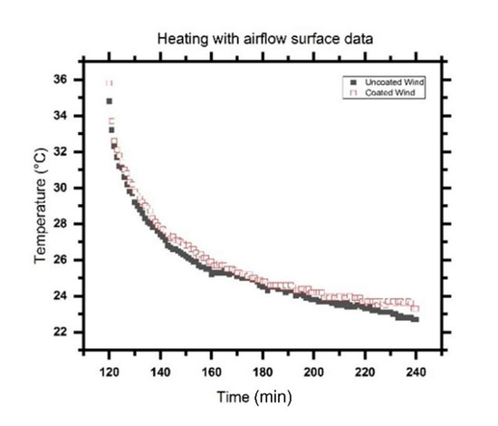 Humid heating (Case 2): In the humidity test, the results of the coating were initially seen after the heating phase, but the temperature difference between the coated and uncoated samples quickly returned to the same temperature and decreased at the same rate. This trend can be seen in Figure 17. The peak difference between the samples’ surface temperatures was 2.6 °C; however, after only 40 min of cooling, the temperatures returned to within 0.5 °C of each other and remained this close for the duration of the cooling phase. The cause of this effect was most likely related to the fluctuation of the humidity level. During the heating phase the humidity decreased to around 15%, essentially simulating the normal heat test so that the effect of humidity was not seen immediately. However, after the heat source is removed and the tank is re-sealed, the humidity quickly rises to between 80 and 85%. The water droplets in the air retain their heat and keep the ambient air temperature warmer for the rest of the cooling phase due to the latent heat properties of water. Since the ambient air temperature cools slowly, it mitigates the effects of the coating, and the temperatures of the coated and uncoated samples remain similar. According to Section 1.1, we can assume that the camera properly accounts for the humidity in the atmosphere and that the atmospheric transmission coefficient is close to 1.0 regardless due to its proximity to the sample.