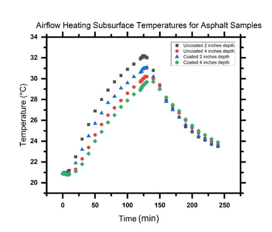Windy conditions (Case 6): The addition of wind conditions to the experimental setup reduced the temperature difference between the uncoated and coated asphalt to 2.5 °C cooler for the coated asphalt. This can be seen in Figure 25. As introduced in Section 1.2, the wind also quickened the pace of heat transfer between the asphalt and the air, leading to a much steeper curve during the first 40 min of cooling compared to the other two tests. Therefore, the temperatures of the coated and uncoated asphalt were nearly the same temperature for most of the cooling phase. The subsurface data, as shown in Figure 26, show a similar trend during the heating phase, where the uncoated temperatures are warmer than the coated temperatures. For instance, an uncoated sample with a delamination at 2-inch depth shows a higher temperature than the coated sample with a delamination at the same depth. However, the temperature difference is smaller than in the other tests. These temperature differences are 1.2 °C and 0.5 °C for the 2-inch depth and 4-inch depth, respectively. Due to the wind cooling the samples relatively quickly, all four subsurface temperatures are nearly the same, starting after only 20 min of cooling and remaining almost identical for the remainder of the cooling phase.
