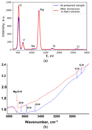 We will begin with the analysis of the barrier properties of the textured layer. Surface heating during laser processing and ablation leads to magnesium oxidation. Thus, it was expected that the main chemical components of the surface layer after laser texturing and hydrophobization are magnesium, magnesium oxide, and fluorosilane. Indeed, this expectation shows to be in agreement with the data of energy dispersion spectroscopy (Figure 6a), IR spectroscopy (Figure 6b), and XRD (Figure 6c) for the as-prepared sample. From the above data, we can conclude that the surface texture is mainly constituted by magnesium oxide, which has Pilling–Bedworth ratio of less than 0.8 and thus, is porous (see Figure 1a). So, such a layer does not hinder access of corrosion media to bare magnesium which can interact with water with the formation of hydroxide. IR-spectroscopy data, presented by the reflectance spectrum (Figure 6b), also indicate the presence of absorption bands in the range 3620–3470 and 2960–2820 cm−1 (shown by red arrows). The former can be attributed to the stretching O-H vibrations in silanol groups formed as a result of the interaction of O-CH3 terminal groups of the fluorosilane molecule with water molecules. Besides, stretching vibrations in water molecules that form the hydration shells around silanol groups, show the IR activity in the range of 3550–3470 cm−1 [32]. The vibrations in the spectral range of 2960–2820 cm−1 are associated with the C-H stretching vibrations [31] in the fluorosilane molecule.