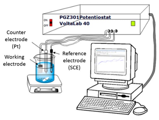 The electrochemical experiments were performed in a three-electrode cell configuration at room temperature. The cell contains a fluorine-doped tin oxide (FTO) coated glass substrate (7 Ω/sq) as the working electrode, a platinum grid as the counter electrode and a saturated calomel electrode (SCE) as the reference electrode. This system was controlled by a Potentiostat VoltaLab 40 (PGZ301 and VoltaMaster 4) (Figure 1). The substrates were ultrasonically cleaned with acetone and ethanol for 10 min each, rinsed with deonized water and dried.