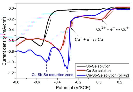 Figure 2 shows the voltammogram of FTO-coated electrode in the Cu–Sb–Se solution; the voltammograms of the Cu–Se and Sb–Se solutions are shown for comparison. A small increase in cathodic current was observed from the beginning of the sweep (+0.07 V/SCE), followed by a plateau between −0.03 V and −0.25 V/SCE. Compared to the Cu–Se solution, the voltammogram of the Cu–Sb–Se solution has no visible peaks corresponding to the respective reduction of Cu2+ and Cu+. This could be explained by their competition with other precursors for adsorption sites at the substrate [14]. After that, the cathodic current becomes larger at −0.3 V/SCE, which refers to a simultaneous deposition of Cu and Se as in the Equation (1) [20]. The second large cathodic peak of Cu–Sb–Se solution at −0.5 V/SCE corresponds to Sb–Se deposition as in Equation (2) [21]. It is interesting to note that the reduction peaks of the Cu–Sb–Se solution show a positive shift compared to the Cu-Se solution and the Sb–Se solution. This may be due to the fact that the presence of the three compounds together promotes the reduction process [14].