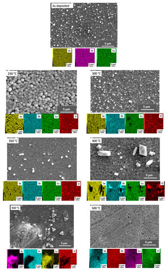 The as-deposited Cu–Sb–Se thin film (Figure 3) exhibits a homogeneous and compact surface with spherical grains of 250 nm in size. The EDX analysis (Table 1) shows that the as-deposited samples are poor in copper and selenium. The annealing process changes the samples morphology depending on the temperature, in a drastic way (Figure 3). At 250 °C, the spherical shapes become disordered and thus expand to a diameter of 1250 nm, turning rough and cracking into small crystal grains with an average size of 125 nm. At 300 °C, the crystal grains continue to grow up to 400 nm in size. They then uniformly spread out on the surface of the substrate. At this temperature, some octahedrons, identified as Sb2O3 by EDX and XRD, start to appear. At 350 °C, the morphology of the deposit was significantly improved, more compact and uniform. From the SEM image, the grains size is reduced to 250 nm, which might be due to the compression effect during the layer growth. Few Sb2O3 crystals are present, even though their sizes increases. EDX analysis shows a sharp decrease in oxygen and a Cu/Sb ratio = 0.86, which increase to 0.91 if we consider the atomic % of Cu, Sb and Se only, close to the stoichiometric CuSbSe2 (Table 1). At 400 °C, the sample became porous with an even distribution of cavities, which could be attributed to the evaporated Sb2Se3 phase [22], resulting from the decomposition of CuSbSe2 as shown in Equation (3) [19]: