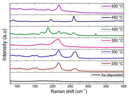 The Raman spectrum of the as-deposited sample shows a very weak and broad peak, as shown in Figure 5 (Figure S4 in Supplementary Materials), which confirms that the electrodeposited and unannealed CuSbSe2 thin film is amorphous. However, the Raman spectra of the samples annealed at 250 and 300 °C show two strong peaks centered at about 217 and 264 cm−1 and four weak peaks at 89, 105, 144 and 154 cm−1. The Raman peaks at 217 (Ag), 154 (Ag), 144 (B2g), 105 (Ag) and 89 cm−1 (Ag) are assigned to CuSbSe2 phase [18,25,26]. The Raman peak at 264 cm−1 is ascribed to A1g of Cu2Se phase [27]. The peaks representing the Sb2Se3 phase are not distinguishable, but it appears that the peak at 189 cm−1 (Ag) due to Se–Sb–Se bonds of Sb2Se3 phase overlaps with the peak at 217 cm−1 (Ag) of the CuSbSe2 phase, resulting in an asymmetric peak broadning [9,25]. At 350 °C, the Raman spectrum is distinguished by two overlapping high peaks at 217 and 208 cm−1, corresponding respectively to Ag and B2g modes of CuSbSe2 phase [18,25]. This overlap can be attributed to a broadening of the peaks probably resulting from the high power of the laser used. Indeed, Kumar et al. [28], had recently studied the effect of the annealing temperature and the excitation power on the Raman spectrum of Sb2Se3. They mention that the laser heating effect always results in anharmonic effects in solids, evidenced by the broadening and redshift of the Raman bands. Besides, a weak peak corresponding to B1g mode of Cu3SbSe3 phase is also observed at about 167 cm−1 [25]. However, the peaks representing the binary phases of Cu2Se (264 cm−1) and Sb2Se3 (189 cm−1) disappeared, confirming their transformation into ternary phases at annealing temperature of 350 °C.