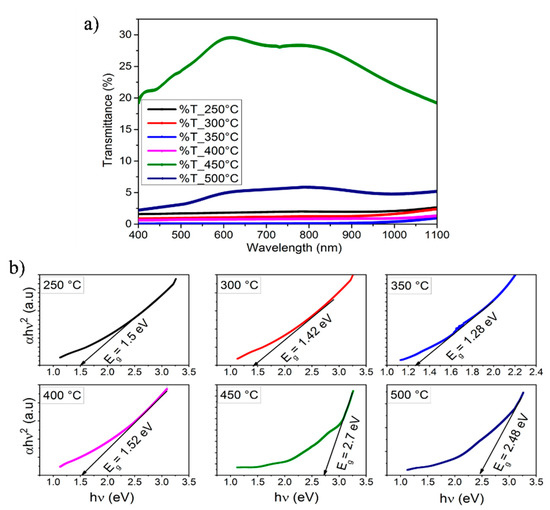 The optical transmittance spectra of all CuSbSe2 thin films were measured in the wavelength range 400–1100 nm as shown in Figure 6a and, as expected, they largely differ depending on the thermal treatment. All the annealed samples show high absorption in the visible to near-infrared (NIR) spectral region 400–900 nm with an optical transmittance ≤6%. However, the sample annealed at 450 °C has a transmittance reaching 30%, that could be due to the shrinkage of the films that uncovers the transparent FTO substrate, as shown by SEM/EDS measurements.