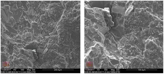 The successful application of modern detection technologies has made the examination of the asphalt mix even better [54,55]; with the help of SEM, the morphology of the mix can be revealed distinctly [56,57,58]. The two kinds of GA-10 mix were subjected to the SEM detection; the effect of the modifier and natural asphalt on the asphalt mix microstructure was characterized and studied. The images are given in Figure 7.