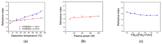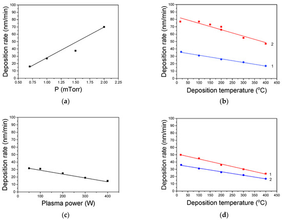An important stage in the development of the CVD process is the kinetic study for the subsequent precision control of the layer thickness. The film growth rate has been calculated by dividing the film thickness (ellipsometry measurements and SEM data) by deposition time. The deposition rate in the ICP CVD process was investigated with respect to dependence on TMDSN vapor pressure, deposition temperature, plasma power, and type of additional gases (Ar or Ar + N2 mixture). All these parameters affect the film growth rate. Figure 1 shows the profiles of the film growth rates at the variable parameters of the deposition process. For samples of series A, the growth rate increases linearly from 16 to 80 nm/min with an increase in the vapor pressure of TMDSN in the reactor chamber in the range of 0.7–2 mTorr (Figure 1a). This is the expected result since an increase in the monomer flow increases the precursor’s amount in the film deposition zone. The temperature dependences of the deposition rate of films for two values of TMDSN vapor pressure (1 and 2 mTorr) are plotted in Figure 1b (series B and C). The film growth rate decreases linearly despite the increase in substrate temperature.