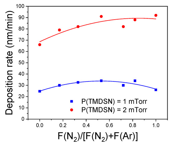 Figure 2 shows the dependence of the film growth rate on the nitrogen content in the initial gas mixture for two values of the TMDSN partial pressure of 1 and 2 mTorr. The deposition rate increases slightly with the increasing nitrogen flow rate. This dependence agrees with information from the literature for plasma-stimulated processes, although significantly lower film growth rates (3–12 nm/min) were obtained in the RPCVD (2.45 GHz, 120 W) process using a mixture of TMDSN with H2 and N2 at 300 °C [13].