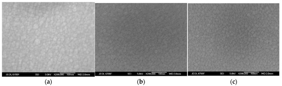 For the determination of film structure, XRD measurements were made by Shimadzu XRD-7000 diffractometer (Shimadzu, Kyoto, Japan) with the high-precision vertical θ-θ goniometers, CuKα radiation, and Ni filter. A range of scattering angles of 5° < 2θ < 60° was covered with a step length of 0.03° and a count time of 1 s. The output beam size is 10 × 10 mm at a divergence angle of 0.22°.