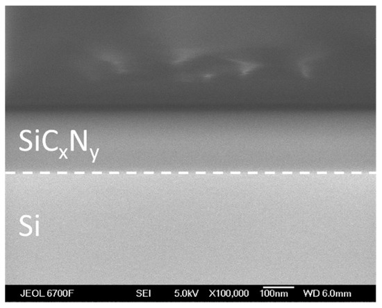 The cross-section view of the SiCxNy:H/Si(100) structure is presented in Figure 4. Based on this observation, it can be concluded that the SiCxNy:H film is homogeneous and defect-free. No discontinuities, cracks, or pores were detected.