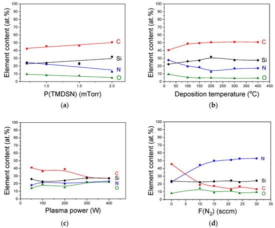 Elemental composition of SiCxNy:H films depending on TMDSN pressure (a); deposition temperature (b); plasma power (c); and nitrogen flow rate (d).