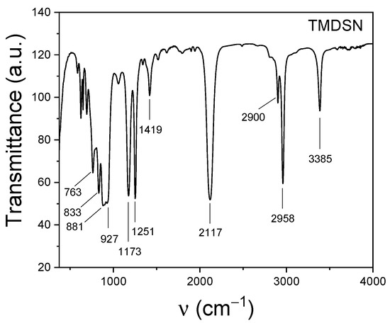 When analyzing the IR spectra of a-SiCxNy:H films, the determination of absorption peaks is a difficult and often controversial task due to many possible bonds and terminating groups. The IR spectra of all samples grown on Si(100) substrates were recorded to study the composition and chemical structure of the synthesized films. The Si(100) substrate after standard chemical treatment was used as a reference sample. The magnitude of the peaks was normalized to the film thickness. The SiCxNy:H films deposited using both TMDSN + Ar and TMDSN + N2/Ar mixtures were studied and compared with the IR absorption spectra of TMDSN precursor (Figure 6 and Table 3). The interpretation of the spectra (the identification of certain absorption bands) was based on the literature data [51,52,53,54,55]. Si–NH–Si group has absorption at 3385 cm−1 from the N–H stretching modes. The NH deformation and bending vibrations give the bands at 1518 cm−1 and 1173 cm−1, respectively. Si–N–Si symmetric stretching vibration shows a band at 927 cm−1. The Si–CH3 group is recognized by the band at 1250 cm−1 due to the symmetric –CH3 deformation, together with bands in the range 865–750 cm−1. The methyl group has two bands at 2958 and 2900 cm−1 corresponding to antisymmetric and symmetric stretching vibrations. The Si–H vibrational mode shows a very strong band at 2117 cm−1.