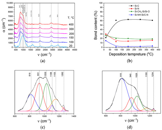 As the temperature increases to 400 °C, the maximum of the base band is shifted to the region of lower frequencies. The deconvoluted IR absorption band for SiCxNy:H film deposited at 400 °C is presented in Figure 7d, where the main band is associated with vibrations of the Si–C (818 cm−1), Si–N (949 cm−1), Si–CH2–Si/Si–O (1028 cm−1), Si–NH–Si/C–N (1160 cm−1), and C–H (1254 cm−1) bonds. The increase of the substrate temperature from 20 to 400 °C causes the elimination of NH and C=N/C=C groups from the films. The position, shape, and intensity of the bands associated with vibrations of CHn, Si–H, and Si-CH3 groups are practically independent of the deposition temperature. This result differs from the data of other authors, who noted a significant drop in the intensity of the absorption band arising from the C–H stretching mode with rising Tdep [20].