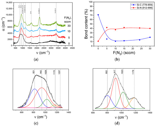 (a) Evolution of FTIR spectra of SiCxNy:H films produced at a different nitrogen flow rate (Series F); (b) The relative integrated intensities of the IR bands from the Si–N and Si–C units. Result of deconvolution into Gaussian profiles of the absorption band in the range of 1300–600 cm−1 for SiCxNy:H films deposited at F(N2) = 0 (c) and 30 sccm (d).