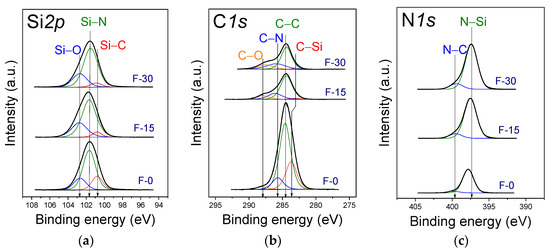 Further confirmation of the chemical structure (local bonding environment) of SiCxNy:H films was obtained using XPS. For this study, three samples of series F were selected, synthesized at the temperature of 300 °C, the plasma power of 200 W, P(TMDSN) = 1 mTorr, and at various values of the nitrogen flow rate of 0, 15, and 30 sccm that were depicted as F-0, F-15, and F-30, respectively. XPS results for the films deposited from both the TMDSN + Ar and TMDSN + N2/Ar mixtures indicate the presence of Si, C, N, and O atoms. Table 4 presents the relative concentrations (atomic ratios) of elements in the near-surface layer of the samples and their comparison with EDX data. It is evident that an increase in the nitrogen flow rate leads to an increase in its concentration in the films. The dependence of change in element content acquired by XPS and EDX has the same tendency, with the exception that XPS data shows the presence of more carbon and oxygen content due to surface hydrocarbon contaminations. Figure 9 shows the Si2p, C1s, and N1s core-level spectra. The asymmetric shape of peaks indicates the presence of these atoms in different chemical environments. To analyze these spectra, the curve-fit analysis was performed. Table 5 shows the obtained values of the binding energies.