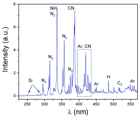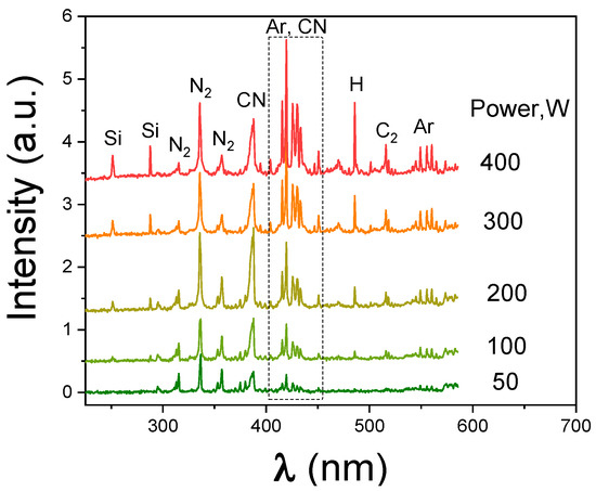 The ICP CVD processes using TMDSN/argon/nitrogen gas mixture were investigated by optical emission spectroscopy. The chemical composition of ICP plasma was controlled with a “Kolibri-2” multichannel spectrometer (VMK “Optoelectronica”, Novosibirsk, Russia) in the spectral range of 200–1200 nm. The interpretation of the emission spectra was based on the literature data [44,45,46]. The figures presented below are for the range of 200–600 nm only, since the spectra have no additional information at higher wavelengths. Emission spectra were recorded for two values of discharge power at 200 and 400 W.