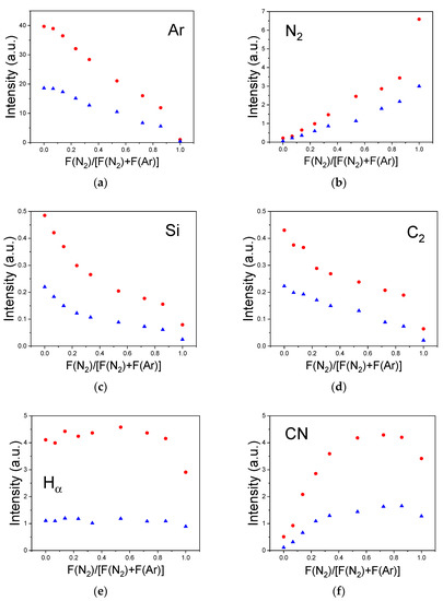 - Jamroz, P.; Zyrnicki, W. Spectroscopic study of the decomposition process of tetramethylsilane in the N2–H2 and N2–Ar low pressure plasma. Diam. Relat. Mater. 2005, 14, 1498–1507. [Google Scholar] [CrossRef]