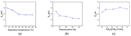 The wettability of a-SiCxNy:H film was evaluated by measuring the contact angle (CA) of two test liquids (water and diethylene glycol), followed by calculating the free energy of the surface. The value of the contact angles of wetting was measured in the sessile drop mode. The water and diethylene glycol wettability of the SiCxNy:H films was assessed as film deposition parameters. As shown in Figure 16a,b, an increase in the deposition temperature did not have a significant effect on the value of the contact angle. The water contact angle was approximately 70°. An increase in plasma power from 50 to 400 W led to a decrease in the contact angle from 78° to 62°. All surfaces were found to be hydrophilic because the water contact angle was always less than 90°.