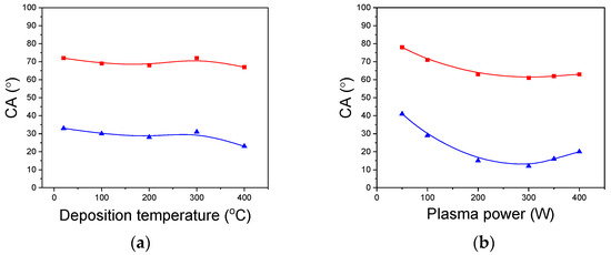 (a) Contact angles as function of deposition temperature (series B). (b) Contact angles as function of plasma power (series D). Test liquids are water (square) and diethylene glycol (triangle).