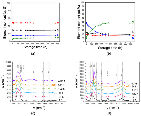 Time dependence of element composition and FTIR spectra of films. Samples SiCN-A (a,c) and SiCN-N (b,d).