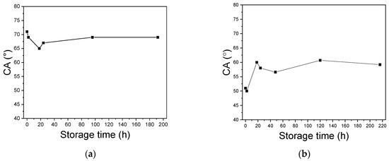 The influence of the aging process on wettability was also investigated for a-SiCxNy:H films (Figure 18 and Table 9). A sharp increase in the water contact angles was observed during the initial stage of aging for both films. However, the film deposited from the nitrogen mixture showed an increase in contact angle by 10°. In this case, the aging process increased the hydrophobicity of the surface, as revealed by an increase in the contact angle of water. The contact angle of a film synthesized from an argon mixture decreased slightly. After several days the water contact angles reach a constant value for both films.