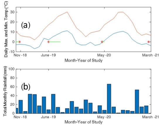 Maximum and minimum temperature and total monthly rainfall for the Central Oregon Agriculture Research and Extension Center during the study. Red stars indicate when samples were scanned, and green lines indicate when samples were in storage awaiting return to the site. (a) mean monthly daily maximum and minimum temperature, (b) total monthly rainfall for the site.