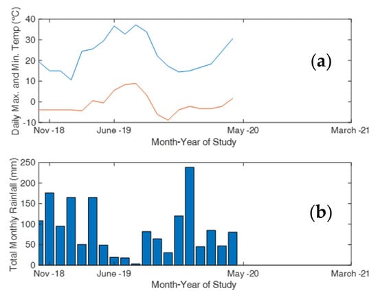 The Madras site has a semi-arid temperate climate with short, warm, and dry summers, and very cold, snowy, and partly cloudy winters []. The site receives 332 mm of precipitation per year (including 259 mm of snow) that mostly falls in the winter and spring months between October and April when the average monthly temperatures range between 0.6 and 9.4 °C []. The site is located 680 m above sea level with average daily shortwave radiation ranging between 1.5 kWh/m2/day in December to 7.9 kWh/m2/day in July []. The average monthly maximum and minimum temperatures and monthly rainfall were obtained from the weather station located at the Research Center (Figure 2).