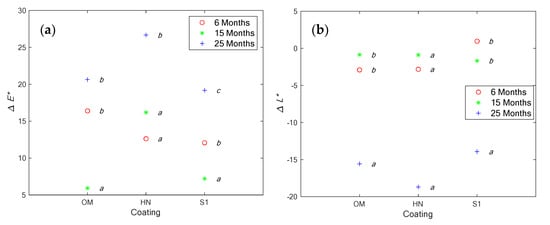 Welch’s ANOVA [] functions in MATLAB (version R2021a) were used to determine significant differences between the mean ΔE of each species/coating pair for each exposure interval at p < 0.05. A Games–Howell [] multiple pairwise post hoc comparison test in MATLAB was performed to determine significant differences in ΔE, L*, a*, and b* for each coating within each species group. This test was also used to determine differences between mean values of the same variables from the former study [] and the corresponding sampling intervals from this study.