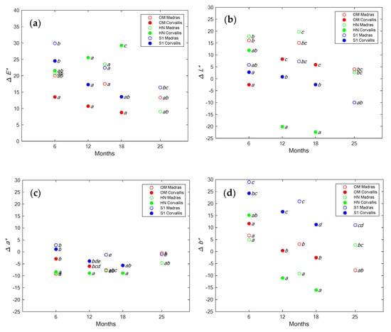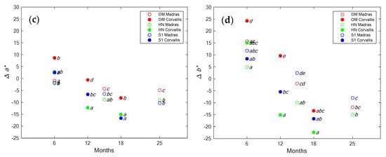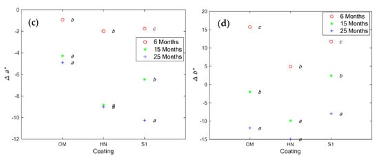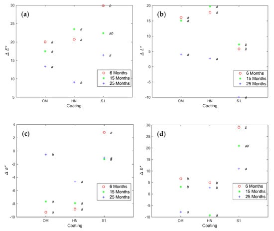 Games–Howell pairwise mean differences in ΔE, ΔL*, Δa*, and Δb* for each coating during study for acetylated wood. Values with the same letter indicate that means between intervals do not differ significantly at p < 0.05. (a) color change (ΔE), (b) ΔL*, (c) Δa*, (d) Δb*.