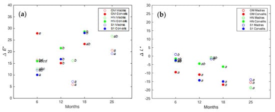 The results are consistent with previous studies of both finished and unfinished wood, although the changes were not always consistent over time [,,,,,,,,,]. For example, ΔE indicated greater darkening (negative change in L* between the initial and each sampling interval) during the first 6 months than for the next 9 months (Douglas fir treated with OM and HN). In other cases, changes in b* indicated relatively uniform decreases between intervals.
