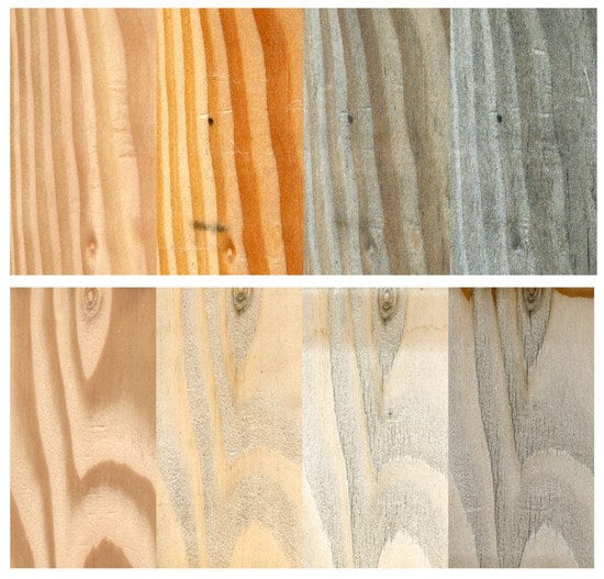 Wood used in exterior structural and appearance applications weathers in four ways, sometimes simultaneously [,]. It can lose color and turn silver or gray, mold fungi can disfigure the surface, decay can develop with prolonged wetting, and/or it can experience dimensional changes that lead to surface checking and warping. Weathering rarely causes structural issues; rather, most short-term weathering impacts the aesthetic attributes that likely influenced the initial specification of wood. Graying is caused by exposure to the ultraviolet (UV) component of sunlight, which preferentially degrades the lignin and extractives on the wood surface [,]. The often simultaneous presence of fungal growth on wood surfaces (commonly referred to as mold) causes unsightly discoloration characterized by black deposits. Discoloration caused by graying of the wood surface or the unarrested mold growth is often unsightly, requiring long-term expense to maintain the desirable visual attributes.