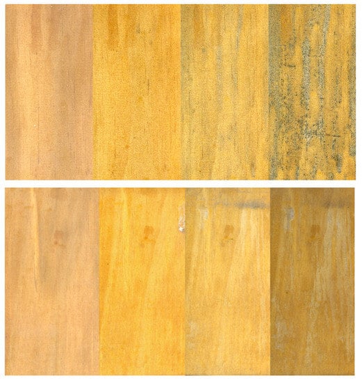 Exterior wood coatings are commonly applied to limit UV-caused degradation or reduce water absorption to minimize dimensional changes, and may also contain biocides that slow fungal growth. Coating performance is highly dependent on interactions between the coating formulation, wood chemistry, and the environment. While opaque coatings (i.e., paint) that block UV light generally perform best, they mask the beauty of the wood. As a result, transparent or semitransparent coatings are often used in appearance applications. These formulations contain combinations of oils, resins, binders, pigments, stains, biocides, stabilizers, and UV absorbers that either form a protective film on the surface or penetrate the wood to provide deeper protection of the wood fibers, lignin, and cellulose [,,,,]. Most coatings protect wood surfaces for 8 to 18 months [,,,,,]; however, a few coatings perform for up to 24 months [,], depending on the wood species, the climate, and the coating type. Coating degradation typically begins with yellowing, loss of gloss, and embrittlement that leads to the development of checks or splits in the wood that allow moisture penetration and slow subsequent drying []. Coating damage also allows UV damage as well as fungal colonization of the wood beneath []. These processes often result in light-colored spots and streaks [] or black and blotchy blemishes on the surface. Some varnishes will develop milky patches [] or they may crack [,], and peel, providing increasing entryways for moisture and microorganisms that further decrease coating integrity.