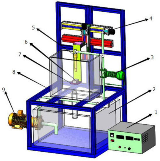 Schematics of the setup used for the jet electrodeposition process. 1—Pulse electrical source, 2—Electrolyte recovery, 3—Rotameter, 4—Servo system, 5—Nickel nozzle, 6—Specimen, 7—Platform, 8—Electrolytic cell, 9—Reciprocating pump.