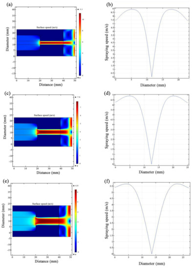 Simulation diagrams of the spraying speed of the electrolyte for preparing Ni–TiN coatings: (a,b) Nf = Φ3 mm, (c,d) Nf = Φ5 mm, (e,f) Nf = Φ7 mm, (g,h) Nf = Φ9 mm.