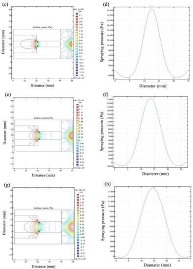 Simulation diagram of the spraying pressure of the electrolyte for preparing Ni–TiN coatings: (a,b) Nf = Φ3 mm, (c,d) Nf = Φ5 mm, (e,f) Nf = Φ7 mm, (g,h) Nf = Φ9 mm.