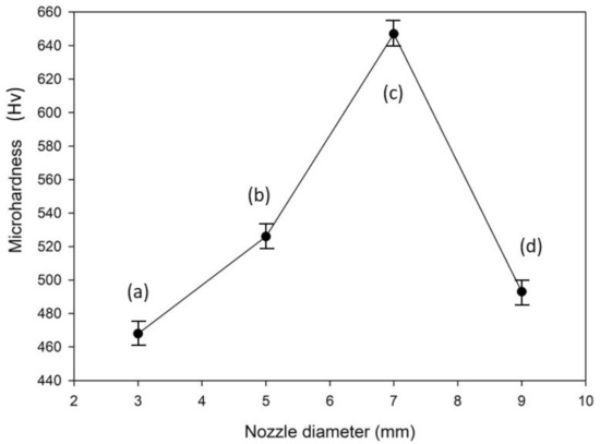 Figure 7 displays the micro-hardness of Ni–TiN CNCs prepared at different nozzle diameters. It can be appreciated from the figure that the micro-hardness of Ni–TiN CNCs produced at the increasing nozzle diameters firstly increased and then decreased. The micro-hardness of Ni–TiN CNCs prepared at Φ3 mm nozzle diameter, calculated using Equation (2) was 468 Hv. The micro-hardness of the Ni–TiN CNCs further increased when the nozzle diameter was increased to Φ7 mm (647 Hv). However, the micro-hardness of Ni–TiN CNCs manufactured at Φ9 mm nozzle diameter was lower than that of Φ7 mm (493 Hv).