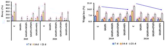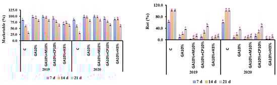 3.1. Weight Loss (%), Decay (%), Rot and Marketable (%)