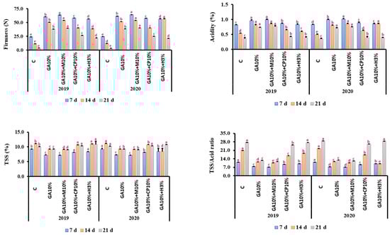 3.2. Firmness (N), TSS (%), Acidity (%), and TSS/Acid (%)